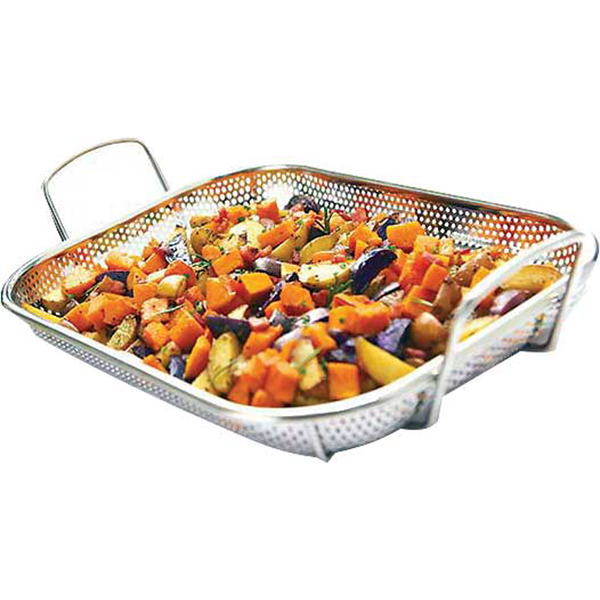 The rectangular 35.6 x 26.0cm stainless roasting basket features micro perforations that create a smooth roasting surface. Easy to clean and perfect to cook on. The tiny holes allow fewer small pieces to fall through into the grill. | |