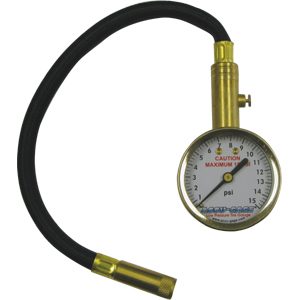 0-15psi low pressure With pressure release bleeder valve 360° swivel chuck 11" (280mm) Flex Hose • Durable steel case with polished brass bezel and 2" dial • Designed to stay accurate • Excellent for all types of passenger vehicles • Lifetime warranty (Manufacturer defect ONLY) Gauge has a full geared, precision movement with bronze bourdon tube. Unlike piston-plunger-type gauges, the bourdon tube movement is not affected by changes in temperature, humidity or altitude. |