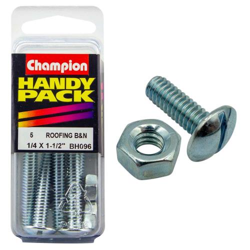 BH096|Champion 1/4in x 1-1/2in Roofing Bolt & Nut Description • Mushroom Head • Slotted • 1/4" x 1-1/2" UNC • Zinc Plated • Pack Size: 10