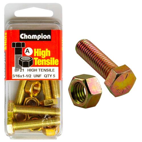 BF21 | Champion 1-1/2in x 5/16in Set Screw & Nut (A) - GR5 Specifications • 5/16" x 1-1/2" • UNF • Zinc Plated • HIGH TENSILE GRADE 5 • Pack Size: 10 (5 x Bolts, 5 x Nuts)