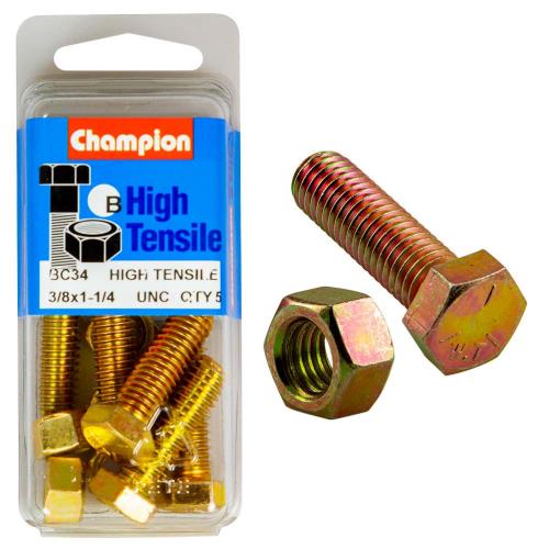 BC34 | Champion 1-1/4in x 3/8in Set Screw & Nut (B) - GR5 Specifications • 3/8" x 1-1/4" • UNC • Zinc Plated • HIGH TENSILE GRADE 5 • Pack Size: 10 (5 x Screws, 5 x Nuts)