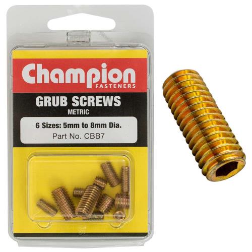 CBB7|Champion 12Pc Metric Grub Set Screw AsST 5MM-8MM Description • Sizes: 5mm x 5mm, 5mm x 10mm, 6mm x 6mm, 6mm x 12mm, 8mm x 8mm, 8mm x 16mm • Pack Size: 12