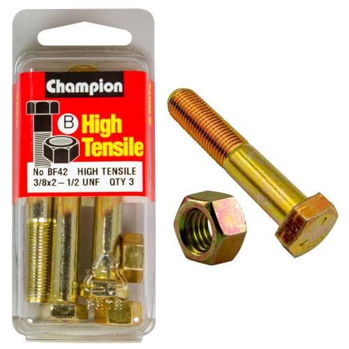 BF42|Champion 2-1/2in x 3/8in Bolt And Nut (B) - GR5 Description • 3/8" x 2-1/2" • UNF • Zinc Plated • HIGH TENSILE GRADE 5 • Pack Size: 6