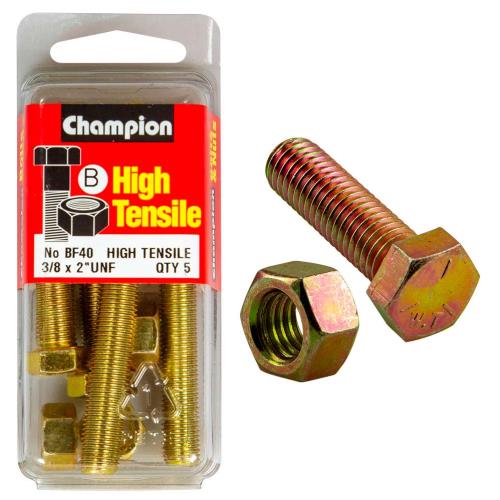 BF40|Champion 2in x 3/8in Set Screw & Nut (B) - GR5 Description • 3/8" x 2" • UNF • Zinc Plated • HIGH TENSILE GRADE 5 • Pack Size: 10