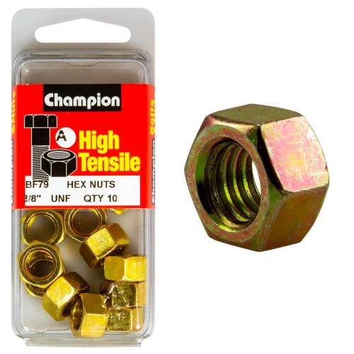 BF79|Champion 3/8in UNF Hex Nut (A) - GR5 Description • 3/8" • UNF • Zinc Plated • HIGH TENSILE GRADE 5 • Pack Size: 10