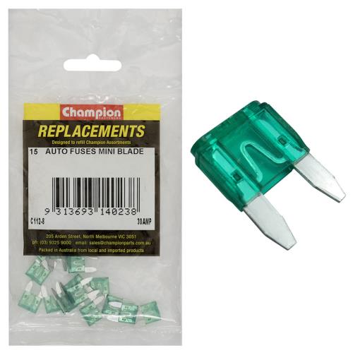 C112-8 | Champion 30Amp Mini Blade Fuse (Green) -15pk Specifications • Pack Size: 15