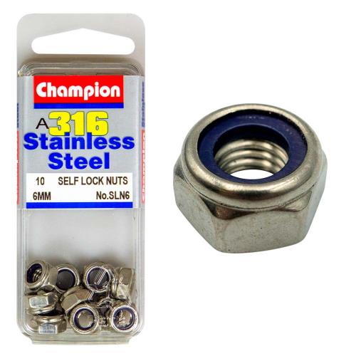 SLN6 | Champion 316/A4 M6 Self Locking Nut (C) Description • Self-Locking • 6mm x 1mm • Metric • Stainless Steel • 316/A4 Marine Grade • Pack Size: 10