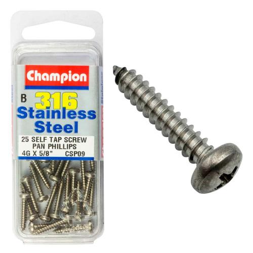 CSP09|Champion 316/A4 S/Tap Set Screw - Pan 4G x 5/8in (B) Description • Self-Tapping • Phillips • 2.9 x 16mm • Metric • Stainless Steel • 316/A4 Marine Grade • Pack Size: 25