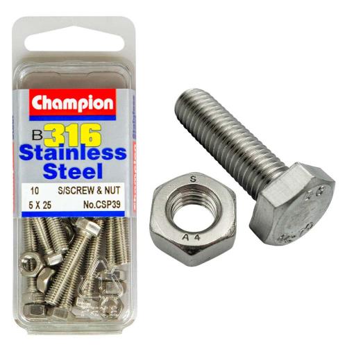 CSP39 | Champion 316/A4 Set Screw & Nut M5 x 25 (B) Specifications • Hex Head • 5mm x 25mm • Metric • Stainless Steel • 316/A4 Marine Grade • Pack Size: 20 (10 x Screws, 10 x Nuts)