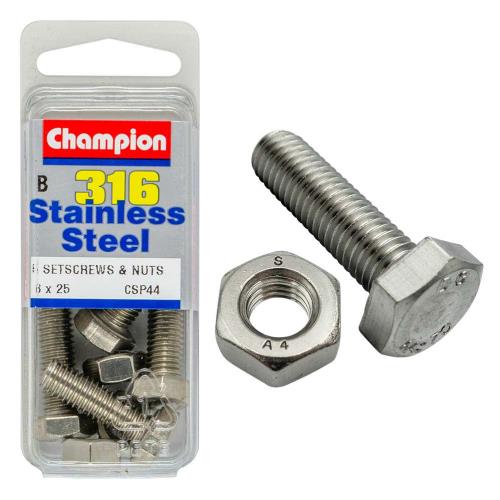 CSP44 | Champion 316/A4 Set Screw & Nut M8 x 25 (B) Specifications • Hex Head • 8mm x 25mm • Metric • Stainless Steel • 316/A4 Marine Grade • Pack Size: 10 (5 x Screws, 5 x Nuts)