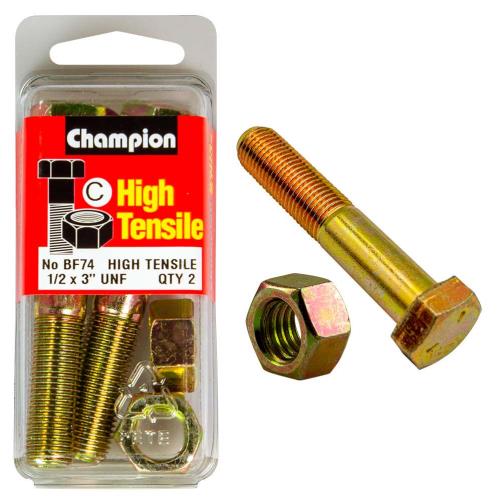 BF74|Champion 3in x 1/2in Bolt And Nut (C) - GR5 Description • 1/2" x 3" • UNF • Zinc Plated • HIGH TENSILE GRADE 5 • Pack Size: 4