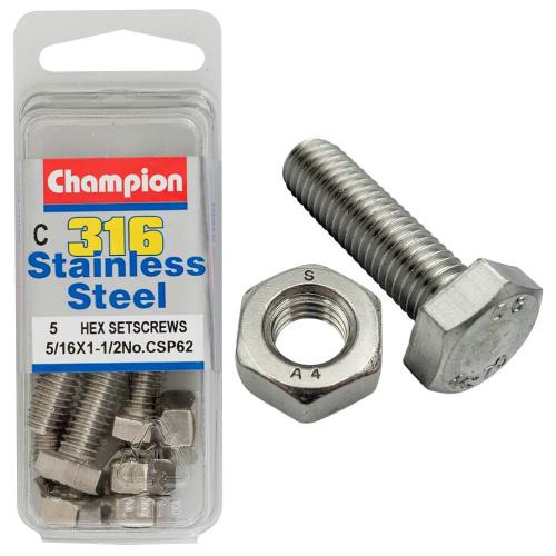 CSP62|Champion 5/16in x 1-1/2in UNC Hex Set Screw 316/A4 (C) Description • Hex Head • 5/16" x 1-1/2" • UNC • Stainless Steel • 316/A4 Marine Grade • Pack Size: 10 (5 x Screws, 5 x Nuts)