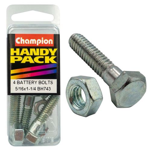BH743|Champion 5/16in x 1-1/4in Sq HD Batt. Bolt & Nut Description • Hex Head • 5/16" x 1-1/4" UNC • Zinc Plated • Pack Size: 4