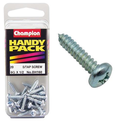BH160|Champion 6G x 1/2in Self Tap Set Screw - Pan HD Description • Self Tapping • Pan Head • Phillips • 3.5mm x 13mm • Zinc Plated • Pack Size: 20