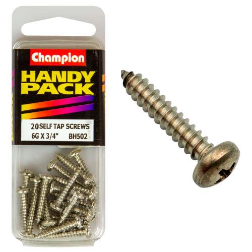 BH502|Champion 6G x 3/4in S/Tap Set Screw - Pan HD Description • Self Tapping • Pan Head • Phillips • 3.5mm x 19mm • Nickel Plated • Pack Size: 20