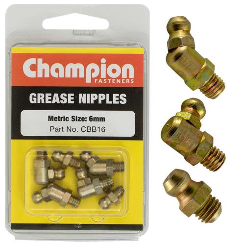 CBB16|Champion 6Pc Metric (6mm) Grease Nipple Assortment Description • Sizes: 6mm x 1mm-STRAIGHT, 6mm x 1mm-45°, 6mm x 1mm-90° • Pack Size: 6