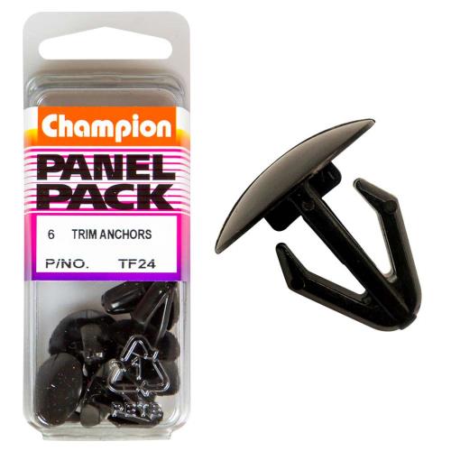 TF24 | Champion Anchor Trim Clip 18mm HD x 16mm -6pk Description • Colour: Black • Length: 15mm • Hole: 8mm • Head: 18mm • Pack Size: 6