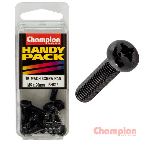 BH812 | Champion Black Machine Screws - M5 x 20mm • M5 x 20mm • Metric • Pan Head • Phillips Head Drive • Black • Zinc Plated • Pack Size: 10