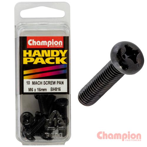 BH816 | Champion Black Machine Screws - M6 x 16mm • M6 x 16mm • Metric • Pan Head • Phillips Head Drive • Black • Zinc Plated • Pack Size: 10