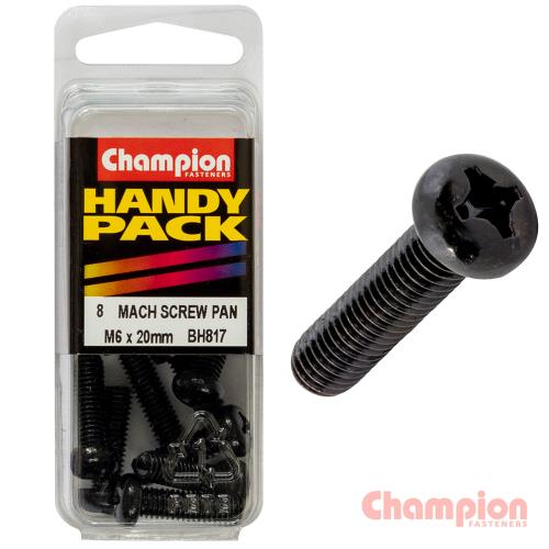 BH817 | Champion Black Machine Screws - M6 x 20mm • M6 x 20mm • Metric • Pan Head • Phillips Head Drive • Black • Zinc Plated • Pack Size: 8
