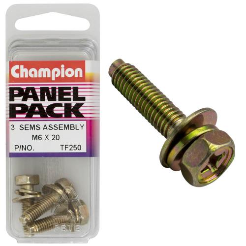 TF250 | Champion Hex Set Screw Sems Hex Ind Combo Dve Flat/Spring Washer Pilot M6X20 Specifications • Hex Ind Combo Dve Flat/Spring • Pilot • M6x20mm • Pack Size: 3