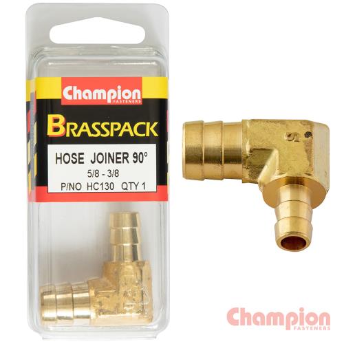 HC130 | Champion Hose Joiner 90 deg Barb Elbow Reducer Brass 5/8-3/8 • HOSE JOINER 90° • BARB ELBOW REDUCER • BRASS • 5/8 - 3/8