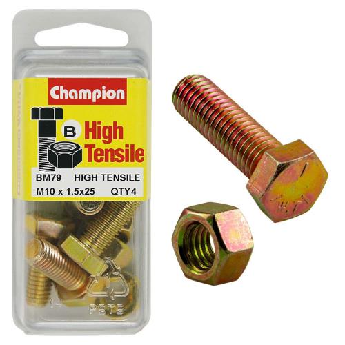 BM79 | Champion M10 x 25 Set Screw & Nut (B) - GR8.8 Description • M10 x 25mm • METRIC • Zinc Plated • HIGH TENSILE GRADE 8.8 • Pack Size: 4