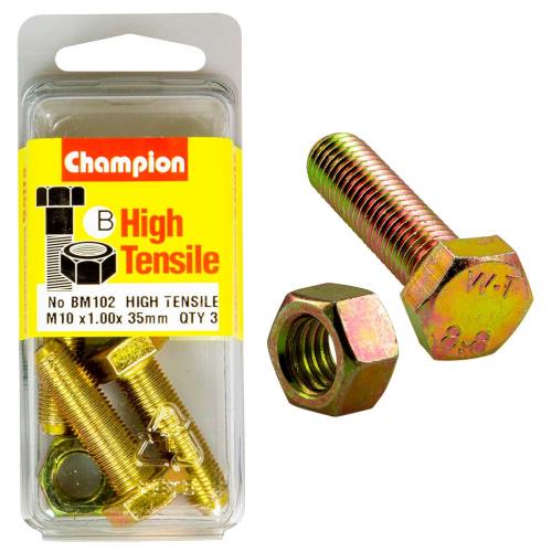 BM102|Champion M10 x 35 x 1.00 Set Screw & Nut (B) - GR8.8 Description • M10 x 35 x 1.00mm • METRIC • Zinc Plated • HIGH TENSILE GRADE 8.8 • Pack Size: 3