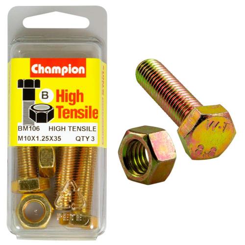 BM106|Champion M10 x 35 x 1.25 Set Screw & Nut (B) - GR8.8 Description • M10 x 35 x 1.25mm • METRIC • Zinc Plated • HIGH TENSILE GRADE 8.8 • Pack Size: 3
