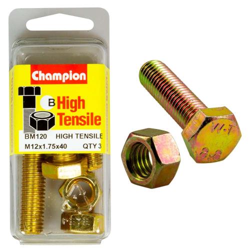 BM120 | Champion M12 x 40 Set Screw & Nut (B) - GR8.8 Description • M12 x 40mm • METRIC • Zinc Plated • HIGH TENSILE GRADE 8.8
