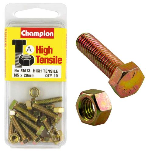 BM13|Champion M5 x 20 Set Screw & Nut (A) - GR8.8 Description • M5 x 16mm • METRIC • Zinc Plated • HIGH TENSILE GRADE 8.8 • Pack Size: 10
