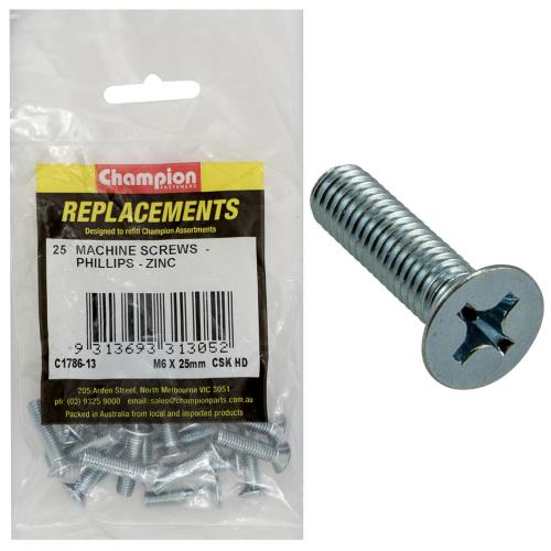 C1786-13 | Champion M6 x 25mm Machine Screw -Csk -Ph -25pk