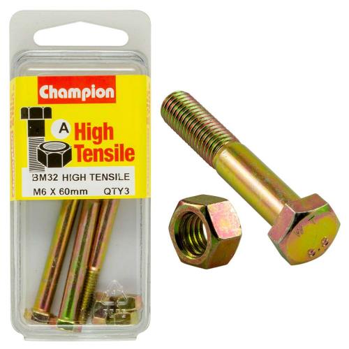 BM32|Champion M6 x 60 Bolt & Nut (A) - GR8.8 Description • M6 x 60mm • METRIC • Zinc Plated • HIGH TENSILE GRADE 8.8 • Pack Size: 3