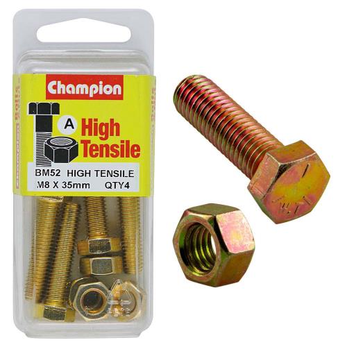 BM52 | Champion M8 x 35 Set Screw & Nut (A) - GR8.8 Description • M8 x 35mm • METRIC • Zinc Plated • HIGH TENSILE GRADE 8.8 • Pack Size: 4