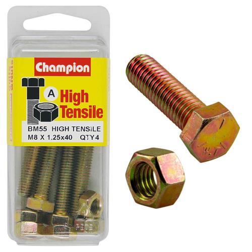 BM55|Champion M8 x 40 Set Screw & Nut (A) - GR8.8 Description • M8 x 40mm • METRIC • Zinc Plated • HIGH TENSILE GRADE 8.8 • Pack Size: 4