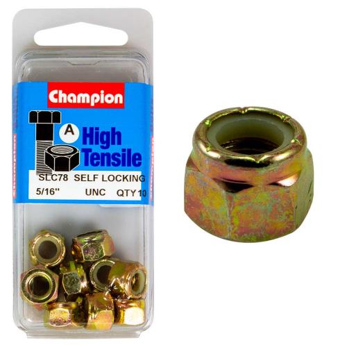 SLC78 | Champion Nyloc Nut UNC 5/16in (A) - GR5 Description • Self-Locking Nylon Insert • 5/16" • UNC • Zinc Plated • HIGH TENSILE GRADE 8.8 • Pack Size: 10