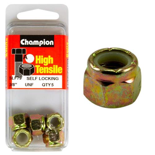 SLF79 | Champion Nyloc Nut UNF 3/8in (A) - GR5 Description • Self-Locking Nylon Insert • 3/8" • UNF • Zinc Plated • HIGH TENSILE GRADE 8.8 • Pack Size: 5