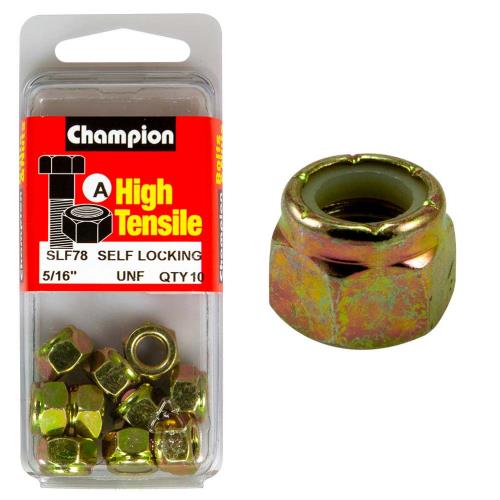 SLF78 | Champion Nyloc Nut UNF 5/16in (A) - GR5 Description • Self-Locking Nylon Insert • 5/16" • UNF • Zinc Plated • HIGH TENSILE GRADE 8.8 • Pack Size: 10