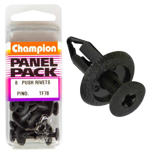 TF78 | Champion Push Rivet Black 14mm HD x 17mm -8pk Description • Colour: Black • Length: 18mm • Hole: 6mm • Head: 15mm • Pack Size: 8