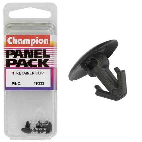 TF232 | Champion Retainer Clip 7mm(L) 9mm(HD) 3pk Specifications • Colour: Black • Length: 7mm • Stem Dia: 5.5mm • Head: 9mm • Pack Size: 3