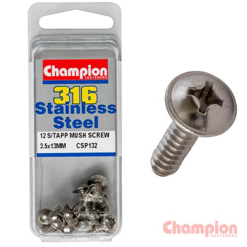 CSP132 | Champion S/Tapping Screws - Mushroom Head - 3.5 x 13mm • 3.5mm x 13mm • Stainless Steel, Marine Grade 316/A4 • Self-Tapping • Mushroom Head • Pack Size: 12