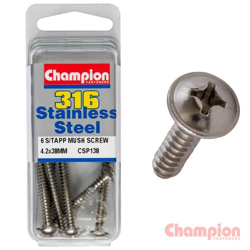 CSP138 | Champion S/Tapping Screws - Mushroom Head - 4.2 x 38mm • 4.2mm x 38mm • Stainless Steel, Marine Grade 316/A4 • Self-Tapping • Mushroom Head • Pack Size: 6