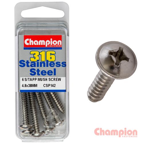 CSP142 | Champion S/Tapping Screws - Mushroom Head - 4.8 x 38mm • 4.8mm x 38mm • Stainless Steel, Marine Grade 316/A4 • Self-Tapping • Mushroom Head • Pack Size: 6