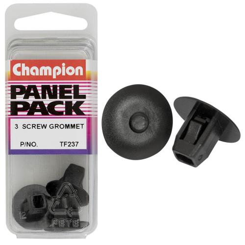 TF237 | Champion Screw Grommet Black 12mm(L) 9mm(Hole) 20mm(HD) 3pk Specifications • Colour: Black • Length: 12mm • Hole: 9mm • Head: 20mm • Pack Size: 3