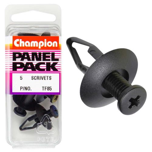 TF85 | Champion Scrivet Clip Black 20mm HD x 20mm -5pk Description • Colour: Black • Length: 20mm • Hole: 8mm • Head: 20mm • Pack Size: 5