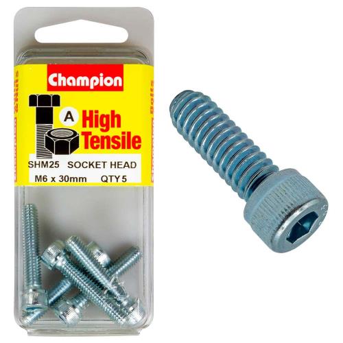 SHM25 | Champion Socket HD Set Screw M6 x 30 (A) - GR12.9 Description • Socket Head Cap • M6 x 30mm • METRIC • Zinc Plated • HIGH TENSILE GRADE 8.8 • Pack Size: 5