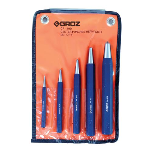 A set of 5 Centre Punches containing one each of 5/64" (2 mm), 1/8" (3 mm), 5/32" (4 mm), 1/4" (6 mm) & 3/8" (10 mm) packed in a vinyl pouch.