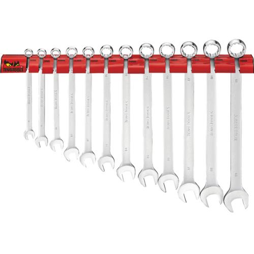 Rack with 12 extra-long metric combination spanners. Chrome vanadium steel.