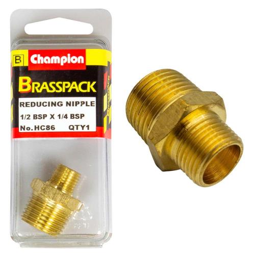 HC86|Champion Brass 1/2in x 1/4in BSP Reducing Nipple Description • Reducing Nipple • BSP • 1/4 to 1/2" • Pack Size: 1