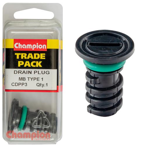 CDPP3 | Champion Drain Plug (Sump) for Mercedes-Benz Type 1 - 1pk Specifications • Mercedes-Benz Oil Sump Drain Screw • 28mm x 37mm • Inner hole: 9mm • ABS plastic • OEM equivalent: 0029902017